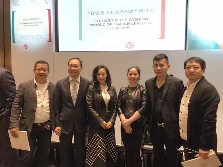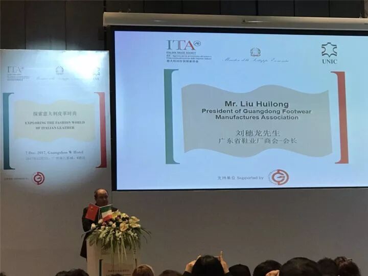 出席本次研讨会嘉宾有: 意大利对外贸易委员会广州代表处首席代表夸特洛奇先生; 意大利驻广州总领事艾古丽女士; 意大利皮革协会代表吴克先生; 广东鞋业厂商会会长、广州鞋业商会荣誉会长刘穗龙先生;