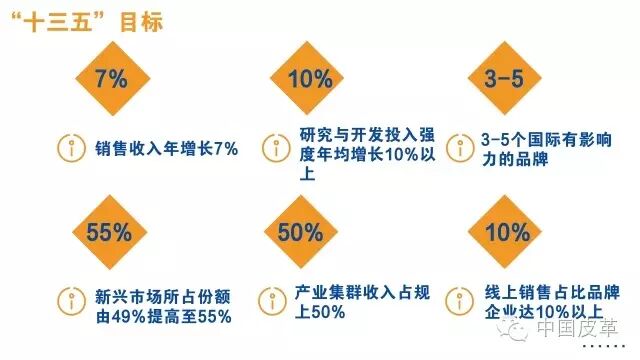 开局之年,辞旧迎新。近日《皮革行业发展规划(2016-2020年)》正式发布,“十大发展目标”也随之出炉。生产与效益、质量品牌效益、设计研发创新等方面均有了新要求,如在质量品牌效益上,加强标准体系建设,鞋的国际标准采标率从90%提高到95%,皮革、毛皮及其制品的国际标准采标率从42%提高到52%。在绿色制造水平上,单位原料皮排放量COD消减15%、氨氮消减25%、废水消减9%,总氮消减30%。其他数据如下图: