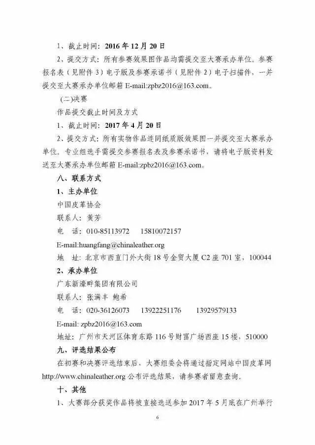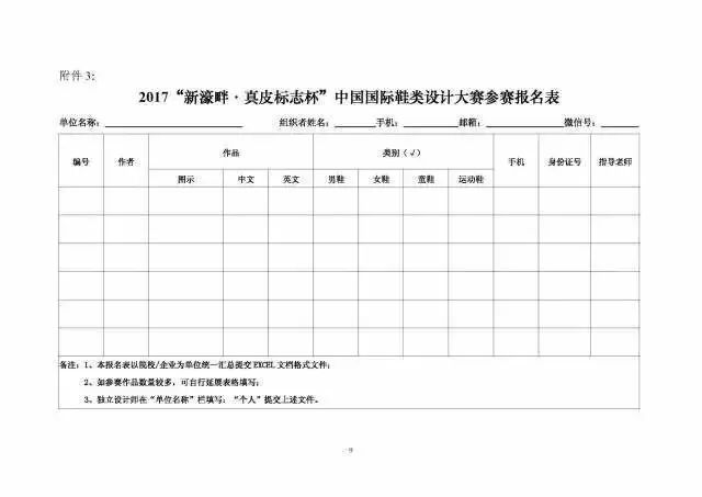 目前,大赛已全面启动,面向广大鞋类企业、设计单位、有关院校发起参赛报名。初赛(院校组)效果图作品需于12月20日前提交至大赛组委会;决赛(企业组)实物照片作品提交截止时间:2017年4月20日前。