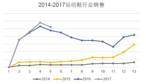 运动鞋产品线:2015年同比2014年增长209.2%,2016年同比2015年增长242.9%,2017年同比2016年4月份截止增长5.9%。