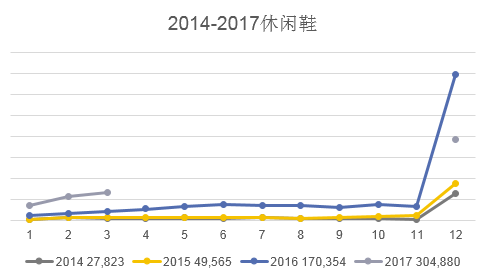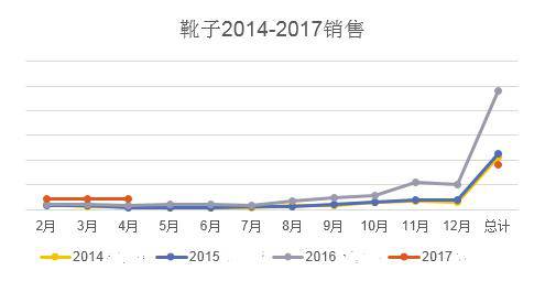 1.鞋行业从2014-2017整体呈现增长趋势:2015年同比2014年增长125%,2016年同比2015年增长234%,2017年同比2016年四月截止增长19%。