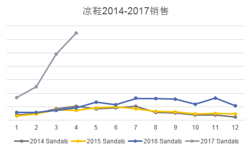 凉鞋产品线:2015年同比2014年增长0.5%,2016年同比2015年增长79.9%,2017年同比2016年4月份截止增长550.7%。