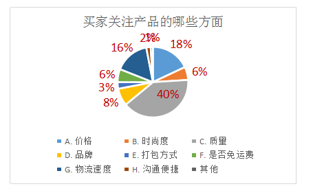 买家购买是最注重产品质量,其次是价格和物流。通常来说,服务好、物流快的店铺产品比较热销,其次,企业类店铺受关注度高,容易赢得买家信赖。
