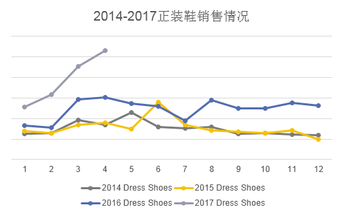 正装鞋产品线:2015年同比2014年增长3.1%;2016年同比2015年增长59.3%;2017年同比2016年4月份截止增长69.8%。