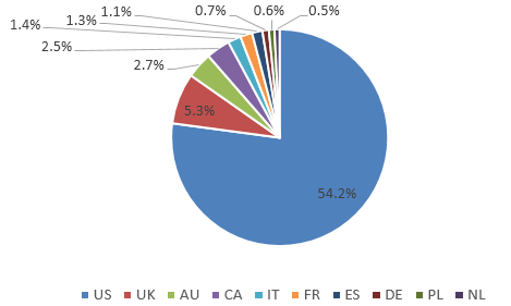 3. 鞋行业的买家分布广,鞋行业买家主要来自美国,占比54.2%,其次是英国、澳大利亚、加拿大、法国等国家。小语种市场和新兴市场也有一定潜力。