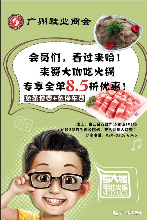 会员们,看过来哈!凭广州鞋业商会会员证到蜀大伽吃火锅专享全单8.5折优惠,免茶位费、免停车费,值得您享用!