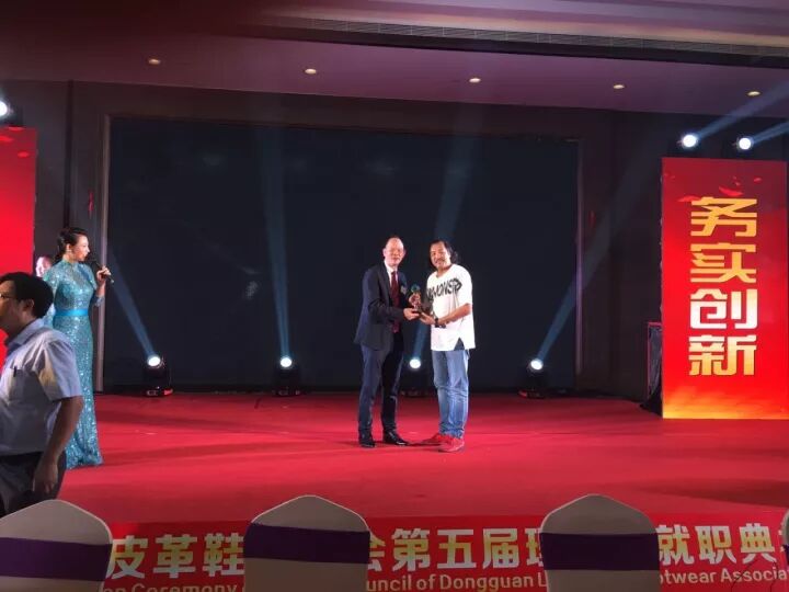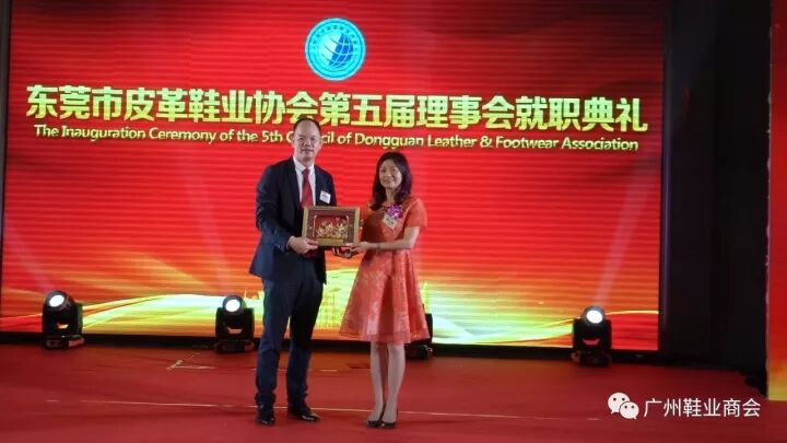 ▲东莞市皮革鞋业协会新任会长尹积琪接受会长牌匾